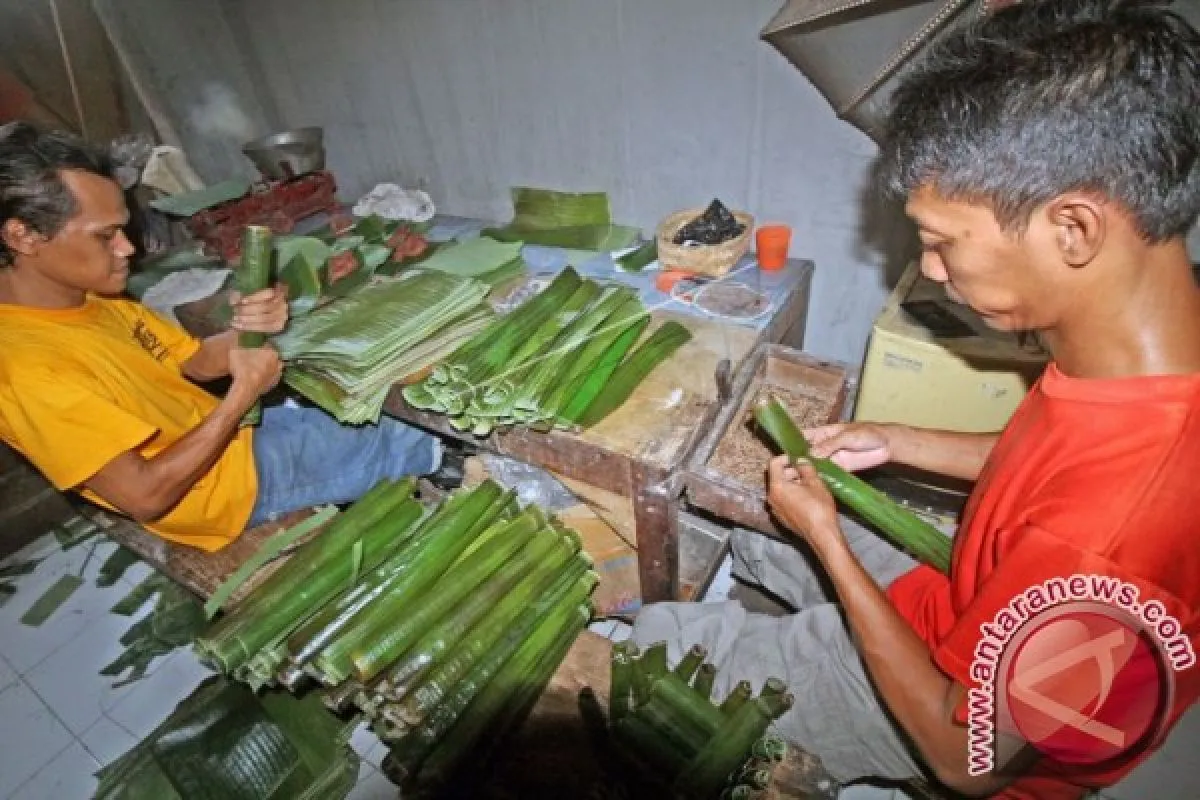 Pekerja membungkus getuk pisang menggunakan daun pisang di kelurahan Tinalan, Kota Kediri, Jawa Timur, Minggu (3/7). Makanan khas Kediri yang biasanya untuk oleh-oleh tersebut menjelang Lebaran mengalami peningkatan permintaan hingga dua kali lipat d