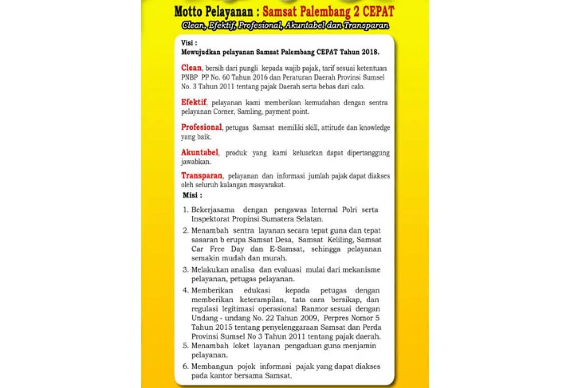 Apalagi pihaknya berkomitmen bersama instansi terkait lainnya dimana pada 2018 memiliki visi dan misi dan motto pelayanan Samsat Palembang II, yakni "Cepat" atau (clean, efektif, profesional, akuntabel dan transparan)