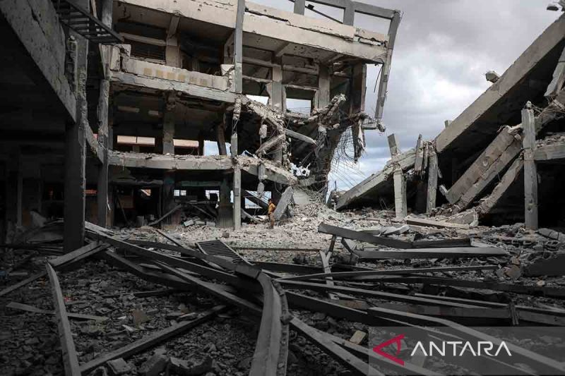 Seorang anak Palestina berdiri di tengah bangunan rusak usai kembali ke Khan Younis, di Jalur Gaza selatan, Minggu (12/10/2025). Kesepakatan gencatan senjata antara Israel dan Hamas berlaku sejak Jumat, 10 Oktober lalu. ANTARA FOTO/Xinhua/Rizek Abdeljawad/rwa.