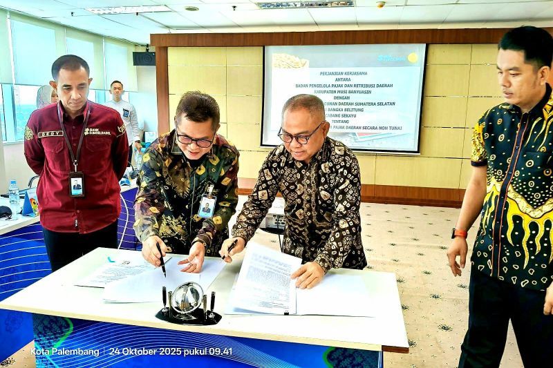 Badan Pengelola Pajak dan Retribusi Daerah (BPPRD) Kabupaten Muba dan Bank Sumsel Babel Cabang Sekayu menandatangani perjanjian kerja sama di Kantor Pusat Jakabaring Palembang, Rabu (29/10/2025). (ANTARA/HO-BSB)