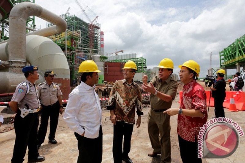 Menteri Perindustrian Saleh Husin (tengah) berbincang dengan Direktur Jenderal Industri Agro Kementerian Perindustrian Panggah Susanto (kiri) dan Managing Direktor Sinar Mas G Sulistyanto (kanan) saat meninjau pembangunan pabrik OKI Pulp & Paper Mills di Sungai Baung Kec Air Sugihan, Ogan Komering Ilir (OKI), Sumatra Selatan, Selasa (1/3). Pabrik OKI Pulp & Paper Mills seluas 1.700ha, berkapasitas produksi 2 juta ton pulp dan 500ribu ton kertas tissue pertahun, dan berpotensi menghasilkan devisa negara 1,5 Miliar Dolar AS/tahun, akan resmi beroperasi pada akhir tahun 2016 . (Antarasumsel.com/Nova Wahyudi/16/den)