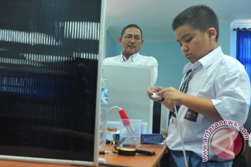 Peserta termuda Cendekiawan Suryaatmadja melakukan percobaan fisika pada ujian praktek bidang Fisika Olimpiade Sains Nasional (OSN) di SMK Negeri 2 Palembang, Sumsel, Rabu (18/5). Peserta berumur 11 tahun asal Bogor yang duduk di kelas XII SMA ini merupakan peserta termuda dengan catatan IQ 189. (Antarasumsel.com/Feny Selly/16/den)